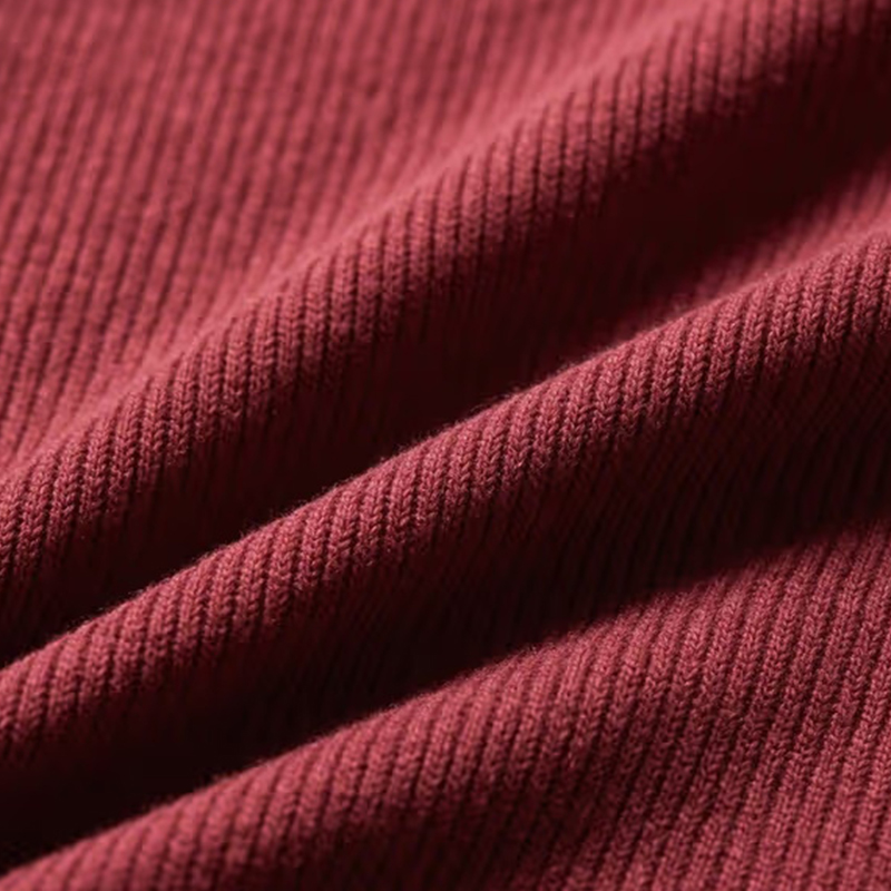 Is fabraic é Fabraic Velvet Ribbed 1 * 1 a úsáideann 1 snáthaid suas 1 próiseas fíodóireachta síos snáthaid, agus tá an dromchla clúdaithe le veilbhit mhín (veilbhit mhín), a bhfuil coinneáil teasa den scoth agus teagmháil bhog aige. Déanann a struchtúr fíodóireachta iomaireach an fabraic an-leaisteach, féadann sé luí go dlúth leis an gcraiceann, agus cuireann sé taithí compordach ar chaitheamh, go háirithe oiriúnach le húsáid i séasúir fuar. Ní hamháin go bhfuil dromchla veilbhit na fabraice bog agus íogair, ach freisin feabhsaíonn sé compord, agus is féidir leis an teas a ghlasadh go héifeachtach agus aer fuar a chosc ó dhul isteach. Tá coinneáil teasa láidir ag an bhfabraic seo agus tá sé oiriúnach le haghaidh éadaí geimhridh, go háirithe coiléar geansaí agus bannaí waist luiteoga, ag soláthar teas agus tacaíocht bhreise do na codanna seo. Tugann a dhearadh ribe 1 * 1 leaisteachas níos fearr don fabraic, rud a ligeann don fhabraic leathnú agus crapadh faoi shaoirse, ag cinntiú go bhfuil sé oiriúnach agus compordach nuair a chaitear é.